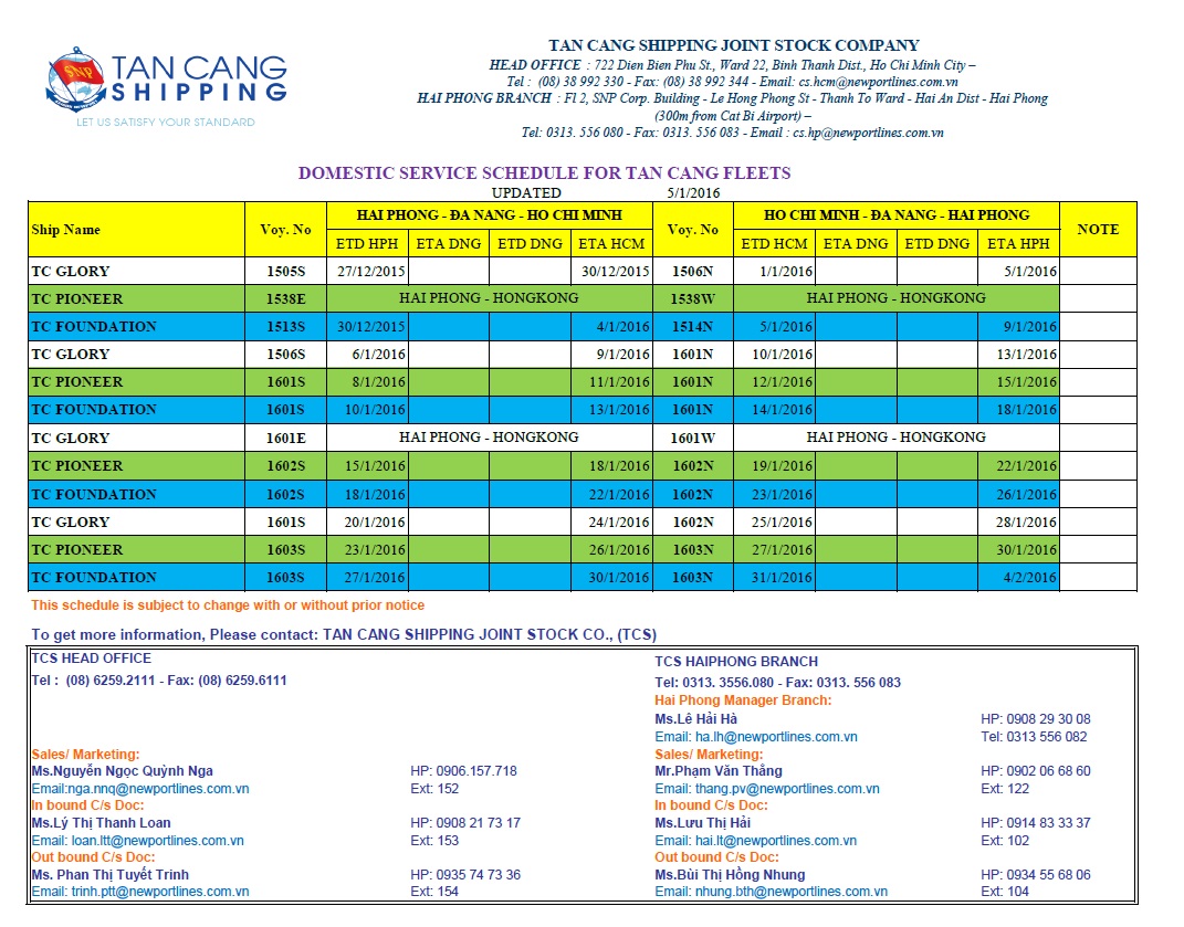 TAN CANG SHIPPING trân trọng thông báo lịch tàu nội địa tuần 01/2016 như sau: