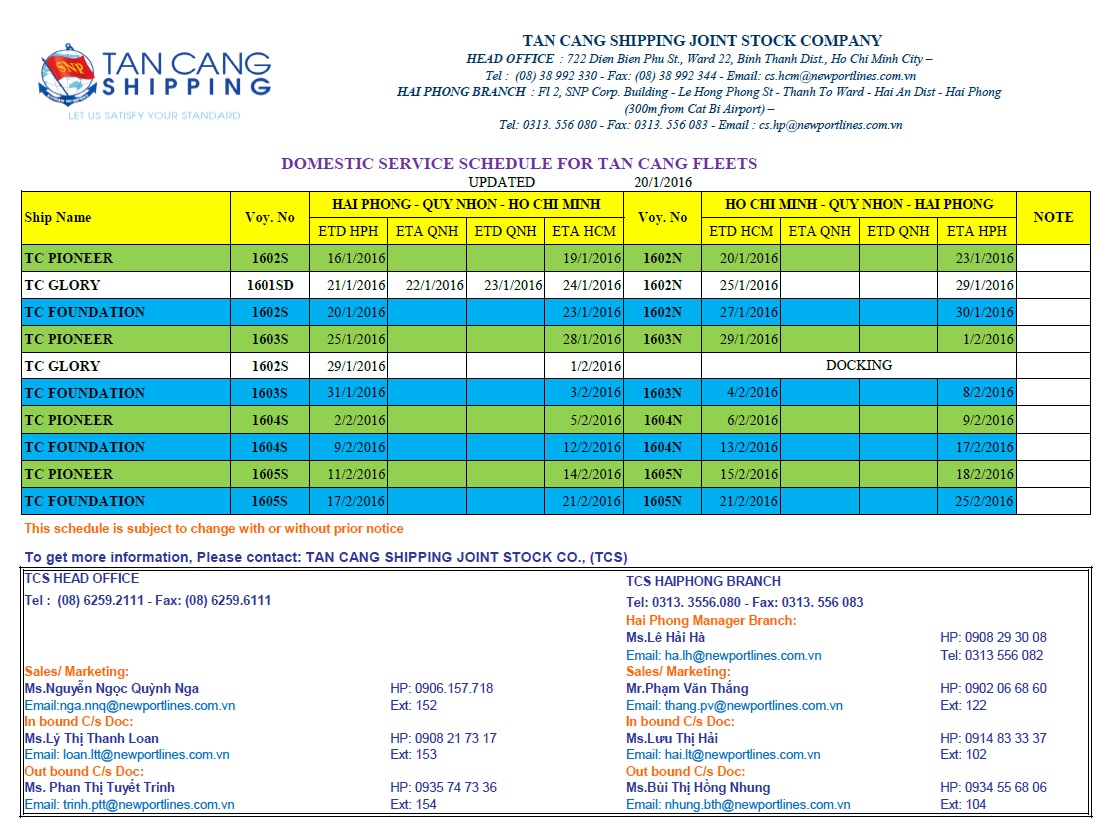 TAN CANG SHIPPING trân trọng thông báo lịch tàu nội địa tuần 03/2016 như sau: