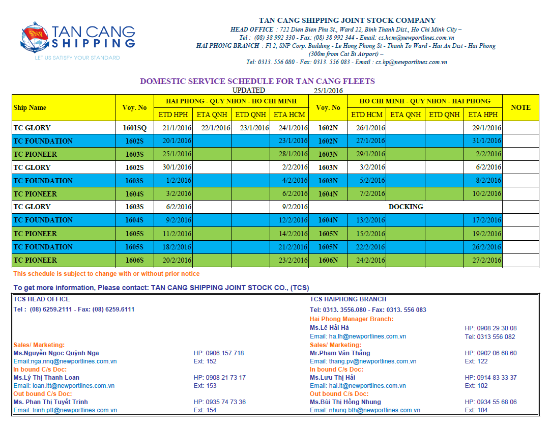 TAN CANG SHIPPING trân trọng thông báo lịch tàu nội địa tuần 04/2016 như sau: