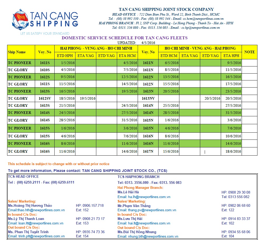 TAN CANG SHIPPING trân trọng thông báo lịch tàu nội địa tuần 18/2016 như sau: