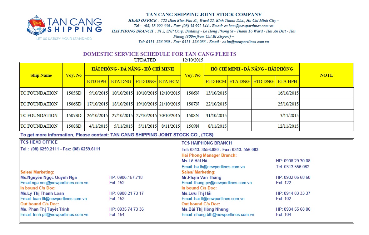 Page Content TAN CANG SHIPPING trân trọng thông báo lịch tàu nội địa tuần 42 của Chúng tôi như sau:
