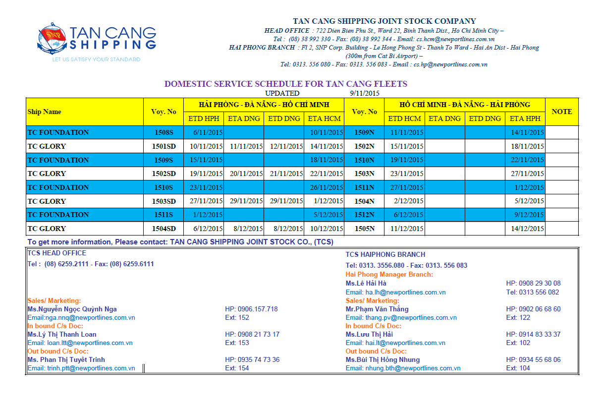 Page Content TAN CANG SHIPPING trân trọng thông báo lịch tàu nội địa tuần 46 của Chúng tôi như sau: