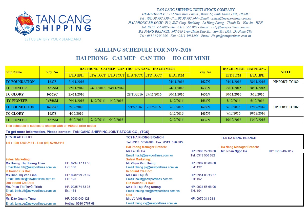 Page Content TAN CANG SHIPPING trân trọng thông báo lịch tàu nội địa tuần 48 của Chúng tôi như sau: