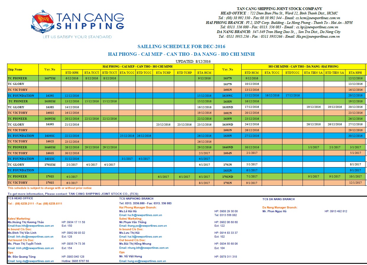 TAN CANG SHIPPING trân trọng thông báo lịch tàu nội địa tuần 51/2016 như sau: