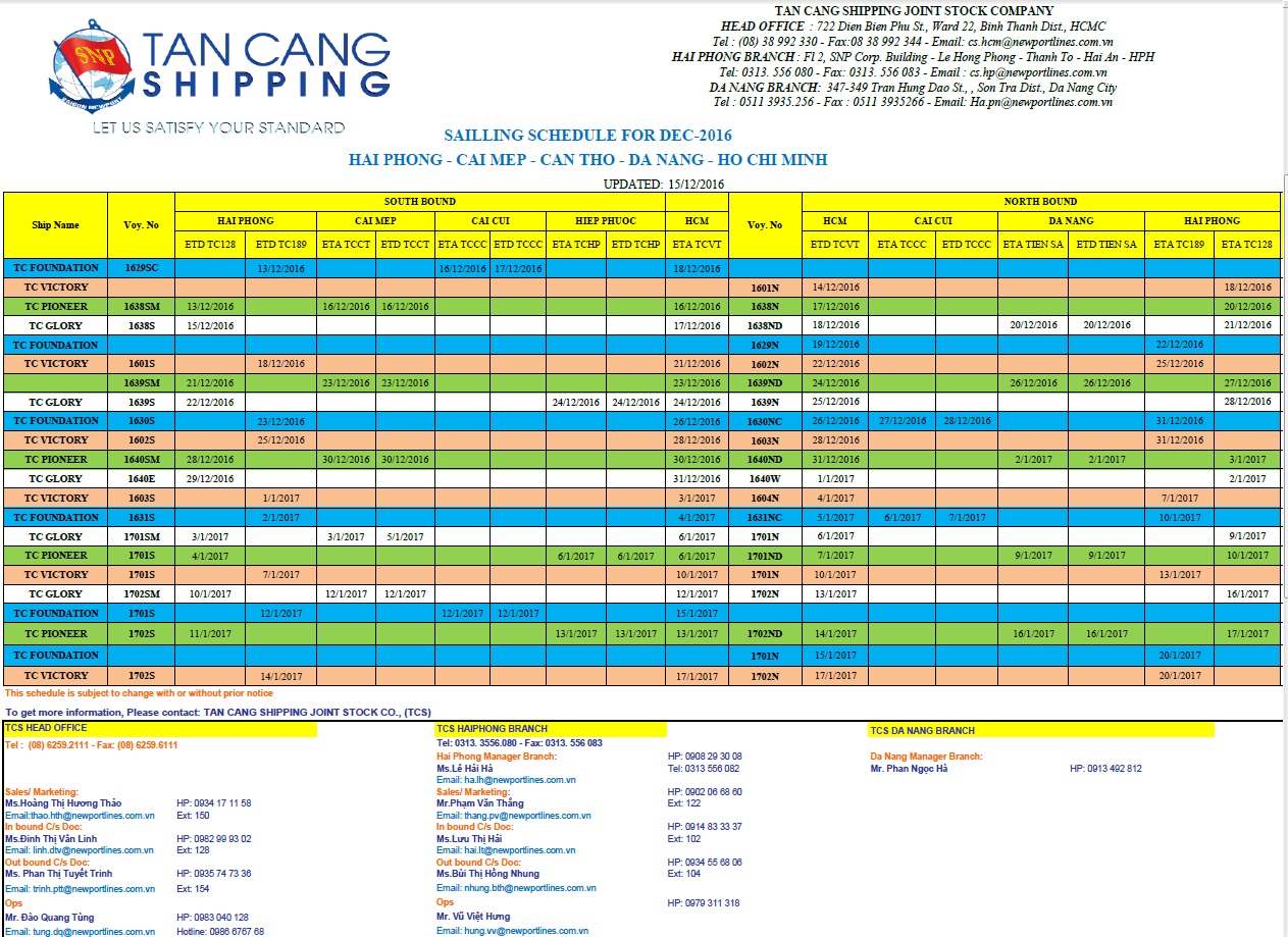 TAN CANG SHIPPING trân trọng thông báo lịch tàu nội địa tuần 52/2016 như sau: