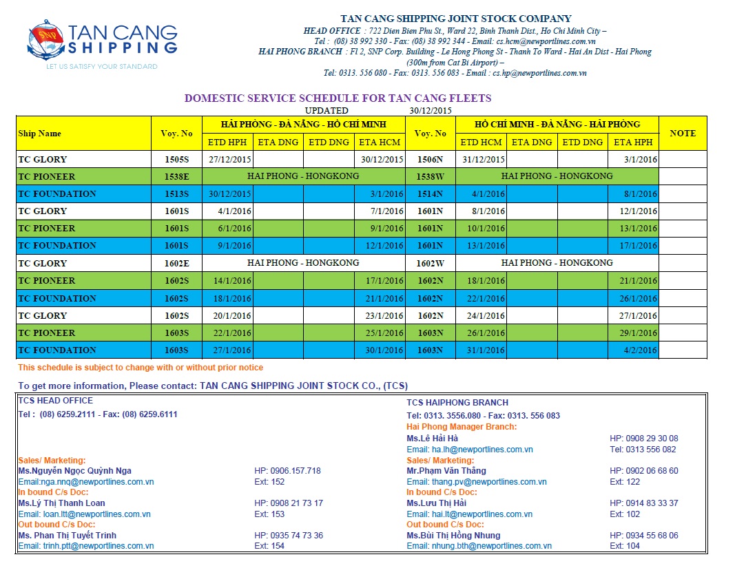 TAN CANG SHIPPING trân trọng thông báo lịch tàu nội địa tuần 53 như sau: